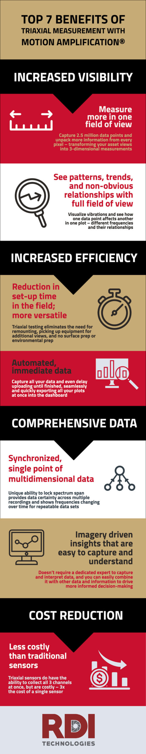 Iris M™ + Stereo Vision is a two-camera Motion Amplification® system enabling full-field vibrational measurements to be taken simultaneously in 3 dimensions/axes. Iris M + Stereo Vision uniquely gives users the ability to acquire synchronized waveform and spectral data in 3 dimensions for virtually any region of interest, anywhere on the asset, in just one data capture. Learn more about the top 7 benefits of triaxial measurement with Motion Amplification® in the infographic below.